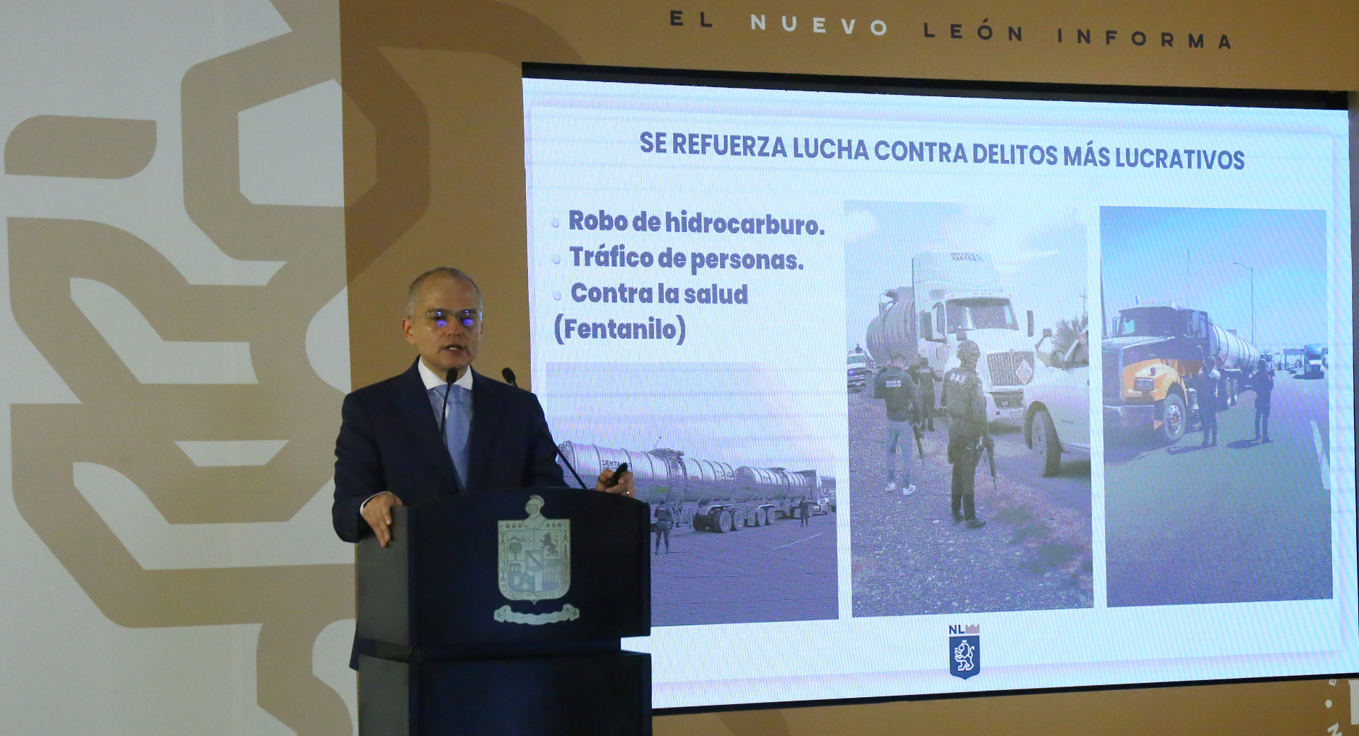 El Secretario de Seguridad destacó la importancia de reforzar la lucha contra delitos que generan más recursos para los grupos criminales, como son los delitos contra la salud (fentanilo, tráfico de personas y robo de hidrocarburos).