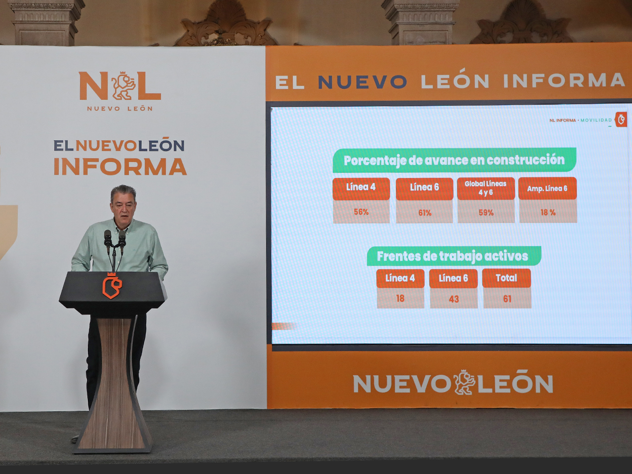 “Los avances que tenemos a la fecha en la Línea 4 es el 56 por ciento, en la Línea 6, el 61 por ciento. De manera global, Líneas 4 y 6, un 59 por ciento. En la ampliación de la línea 6, que va de Apodaca al aeropuerto, un 18 por ciento. Y tenemos 18 frentes de trabajo en la Línea 4; 43 frentes de trabajo en la Línea 6; en total, 61 frentes de trabajo”, apuntó.