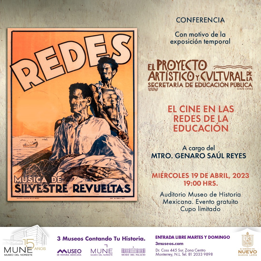 El marco de la exposición, El proyecto artístico y cultural de la Secretaría de Educación Pública (1921-1946) el Mtro. Genaro Saúl Reyes impartirá la conferencia El cine en las redes de la educación, para abordar el cine nacionalista presente en película Redes y la presencia del maestro rural en películas como: Corazón de niño, Río Escondido y La maestra inolvidable, entre otras, el 19 de abril a las 19:00 horas en el Museo de Historia Mexicana.