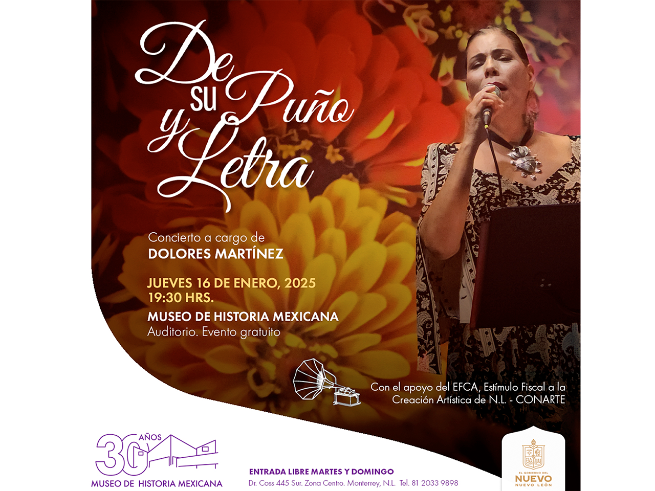El espectáculo “De su puño y letra” se llevará a cabo el jueves 16 de enero a las 19:30 horas en el Auditorio del Museo de Historia Mexicana. La entrada es libre y la cupo limitada. Para más información, visite www.3museos.com.