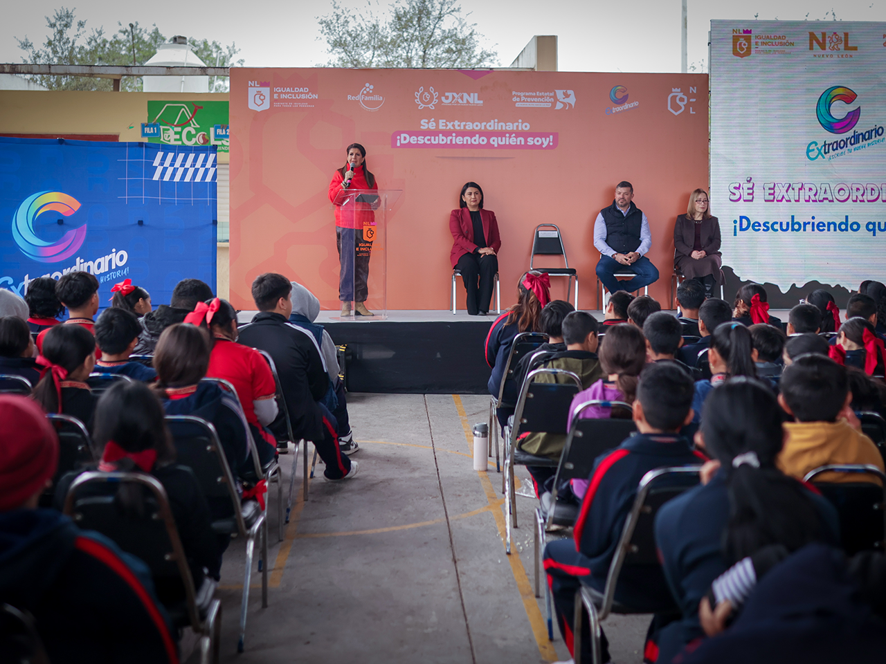 Durante su mensaje en la Sexta Jornada del programa “Sé Extraordinario”, realizada en la Escuela Secundaria No. 2 “Prof. Gustavo Garza Guajardo”, en El Carmen, la titular de la Secretaría de Igualdad e Inclusión, Martha Herrera, destacó el trabajo colaborativo con Red Familia A.C. para seguir impulsando acciones a favor de las juventudes de Nuevo León.