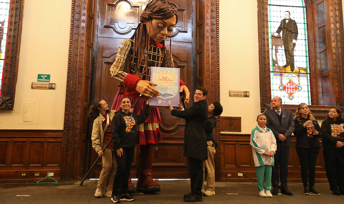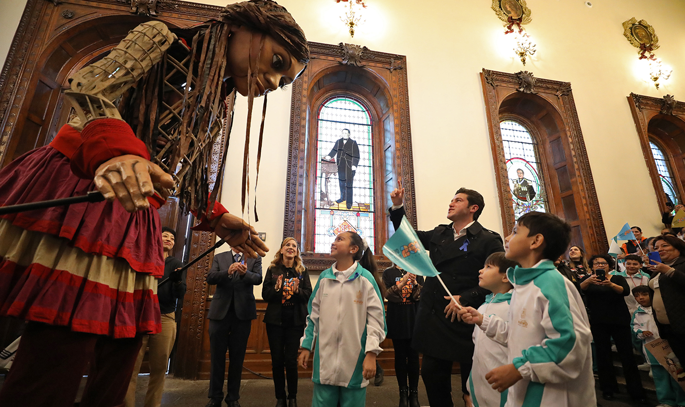 Monterrey, Nuevo León.- El Gobernador Samuel Alejandro García Sepúlveda dio la bienvenida a Nuevo León a la pequeña Amal, una marioneta de 3.5 metros de altura que representa a una niña siria de 10 años, la cual es el símbolo de los derechos humanos, especialmente de la infancia refugiada.