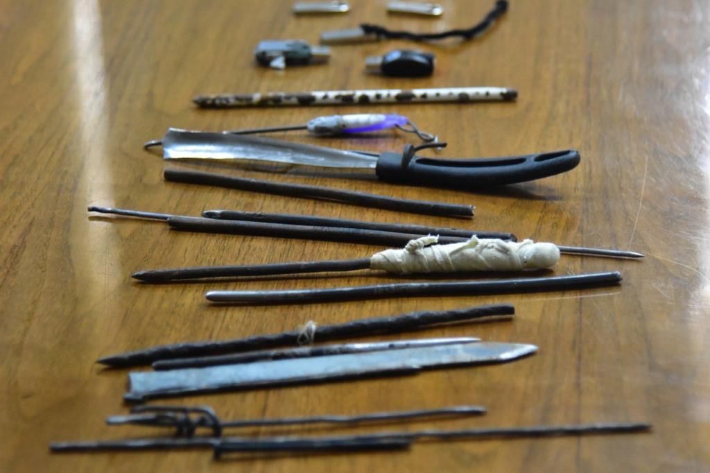 Durante la revisión se aseguraron diversos artículos, tales como un mini teléfono celular, cinco unidades USB, 17 objetos punzocortantes, 500 mililitros de cristal líquido y una dosis de marihuana.