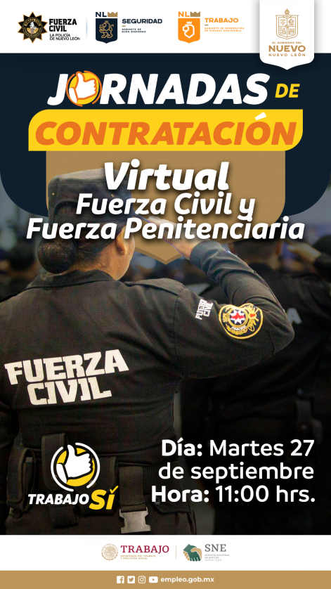 Durante la semana, el día 27, se realizará la primera jornada de contratación en modalidad virtual para trabajar en el sistema se seguridad pública a partir de las 11 de la mañana a través de #FacebookLive de la Secretaría del Trabajo.