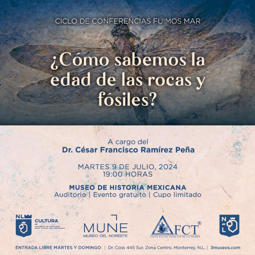 La conferencia “¿Cómo sabemos la edad de las rocas y fósiles?” del Dr. César Francisco Ramírez Peña, será el martes 9 de julio a las 19:00 horas, en el Auditorio del Museo de Historia Mexicana, las personas interesadas en más información pueden consultar www.3museos.com.