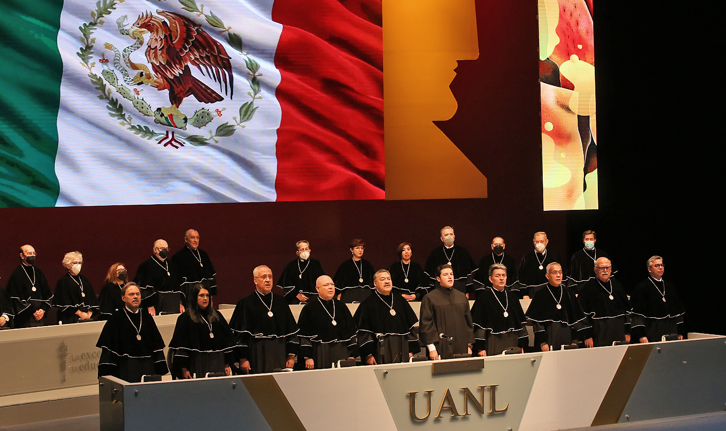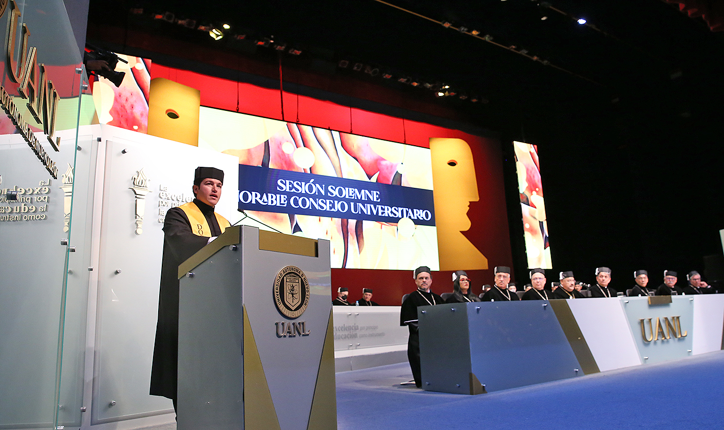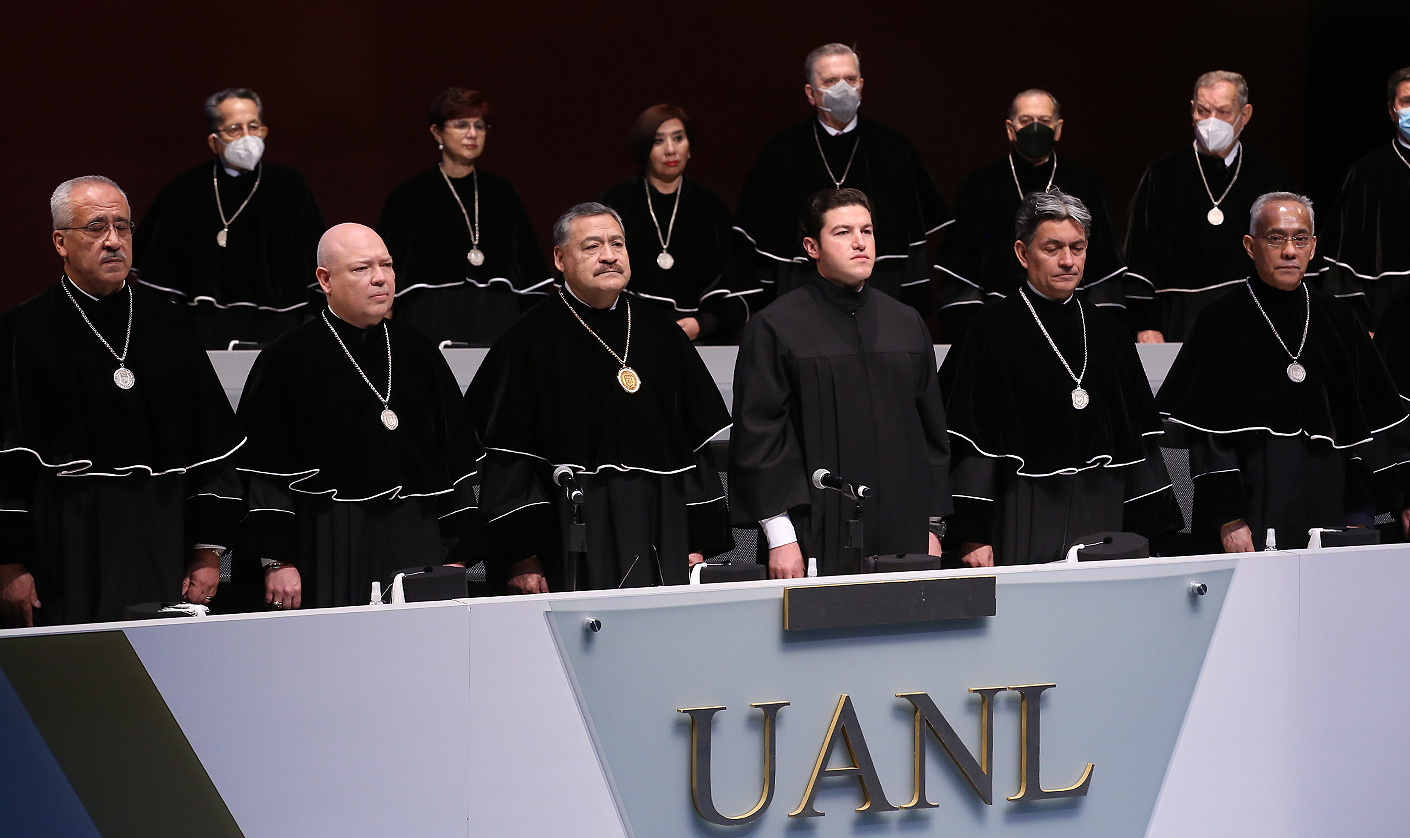 Previo al mensaje de García Sepúlveda, el Rector Santos Guzmán López mencionó que esta es la primera ocasión en la historia de la UANL que un Gobernador en funciones se titula con grado de Doctor.