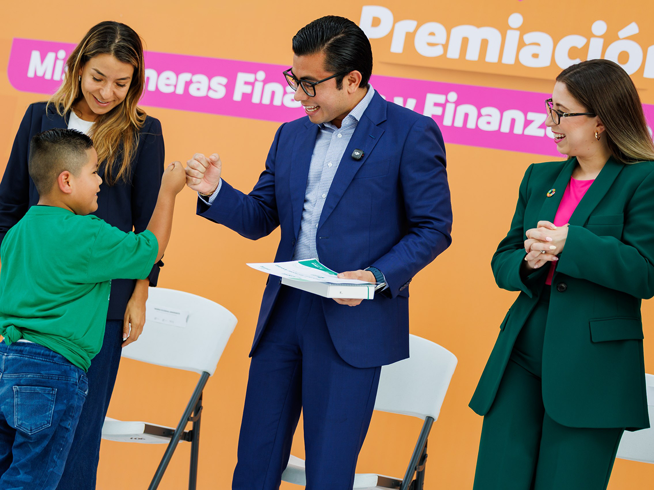 Arratia Cruz, reconoció y premió a seis niñas y niños ganadores del concurso de dibujo de Mis Primeras Finanzas y a tres emprendedoras por realizar el mejor plan de negocio y administración de sus finanzas personales y tomó protesta a los 400 beneficiarios que reafirmaron su compromiso de seguir ahorrando y cuidando sus finanzas.