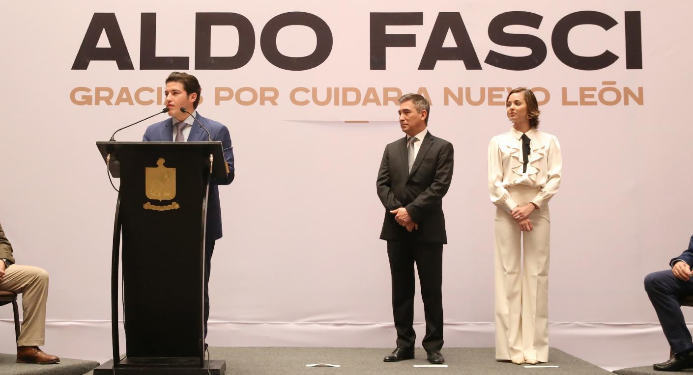 El Gobernador Samuel Alejandro García Sepúlveda reconoció a Aldo Fasci Zuazua, quien deja el cargo como Secretario de Seguridad, destacando su trayectoria y labor en pro de la seguridad pública de Nuevo León.