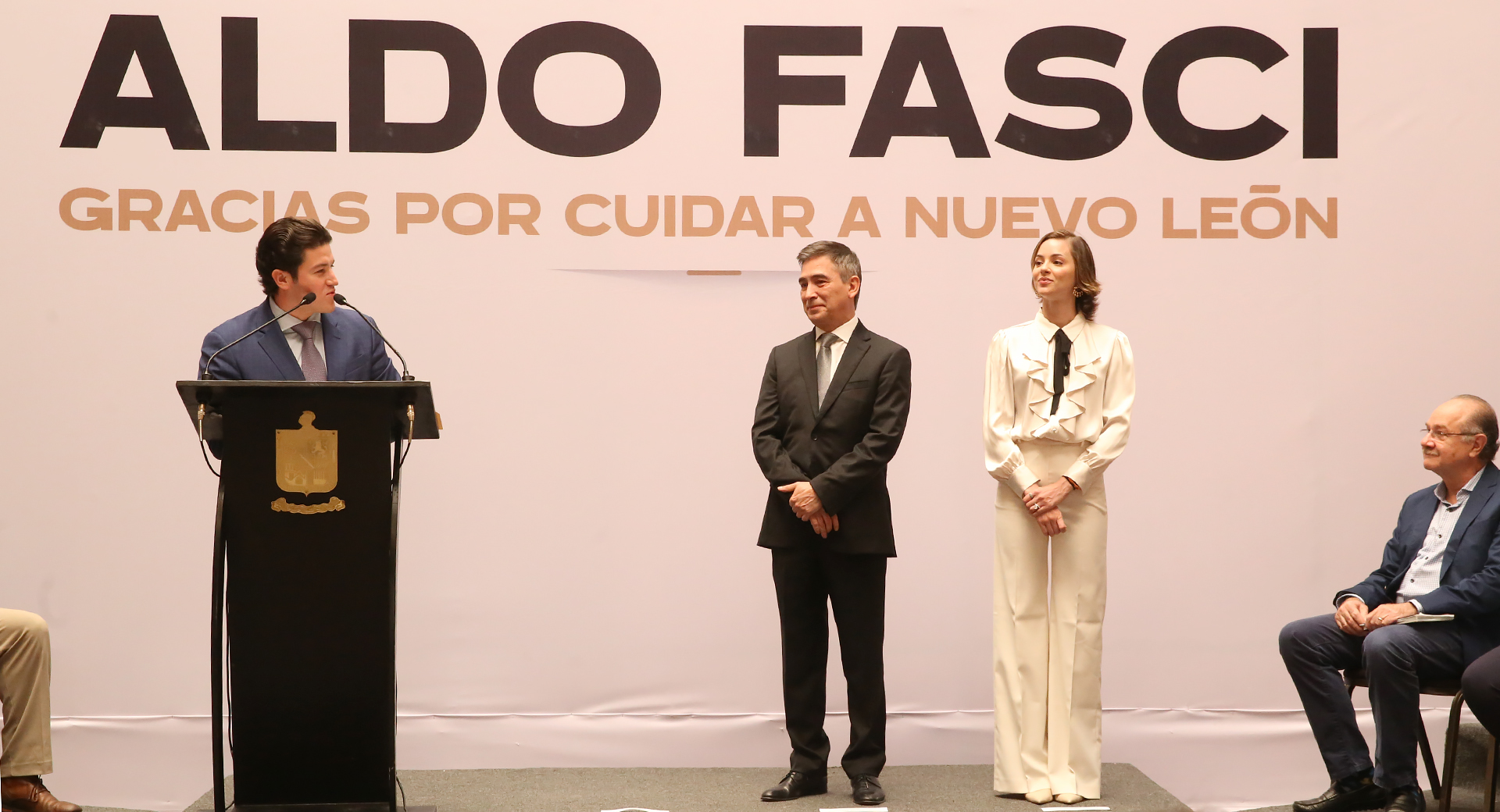 Al reconocimiento a Aldo Fasci asistió su familia, así como funcionarios del Gabinete Central y Ampliado, y funcionarios estatales, federales y municipales integrantes de la Mesa para la Seguridad de Nuevo León.