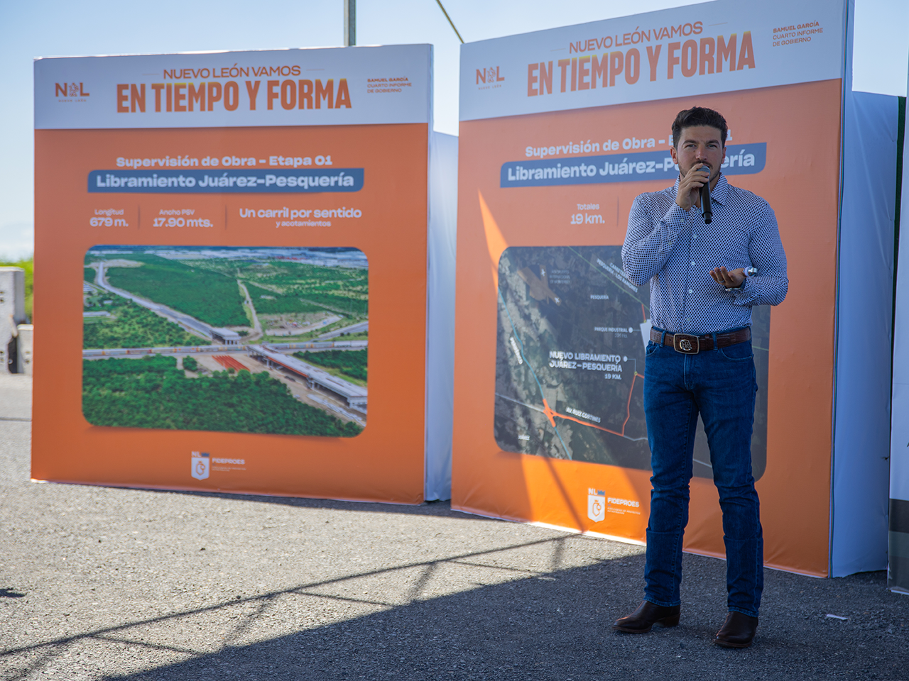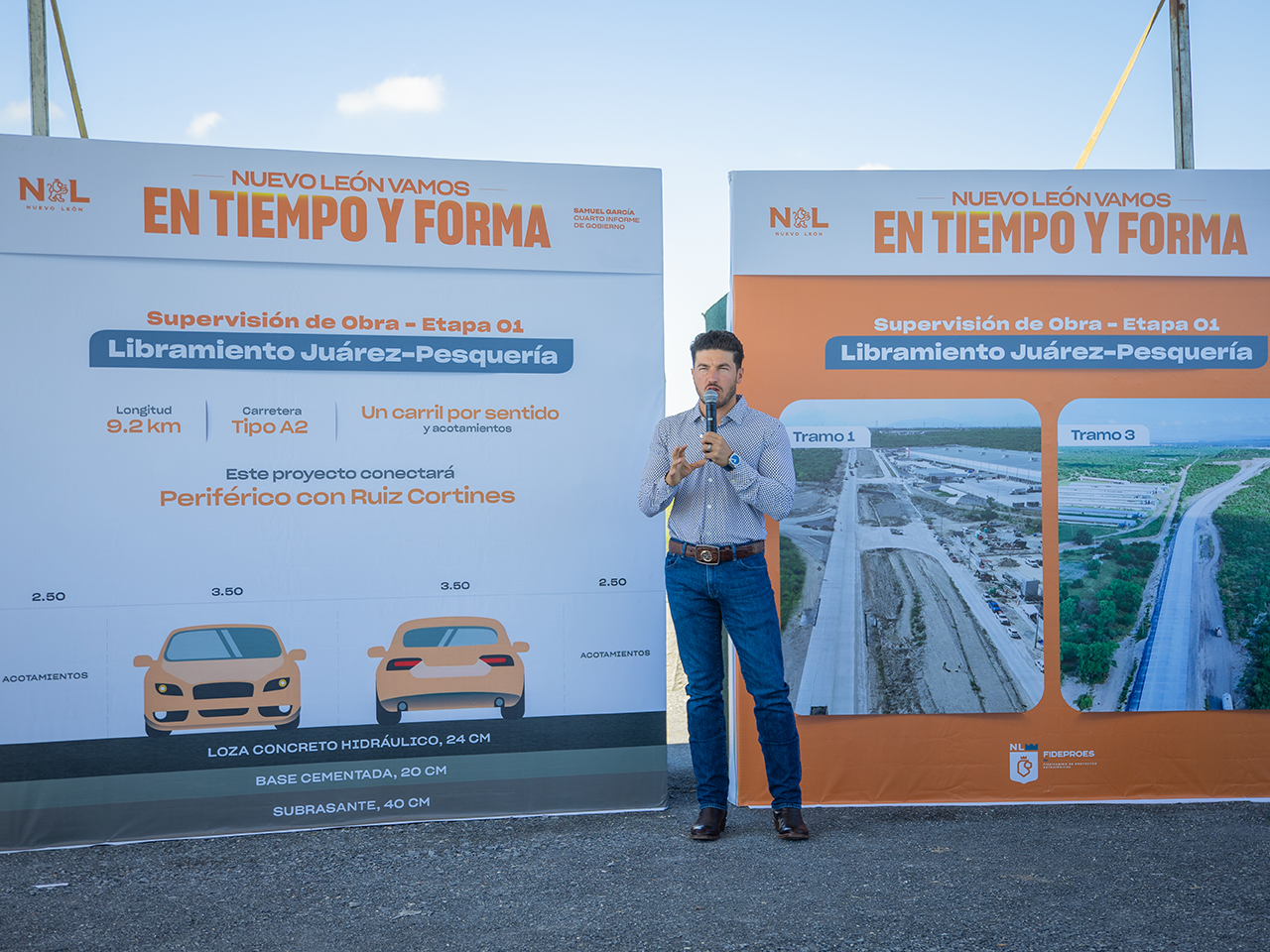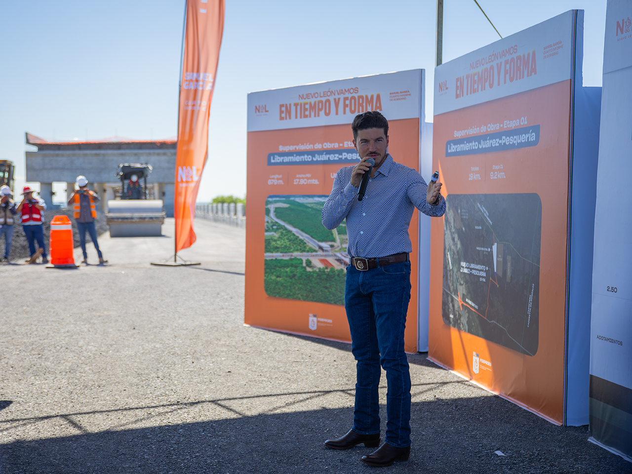 Pesquería, Nuevo León.- Con el compromiso de mejorar la infraestructura vial y urbana, el Gobernador Samuel Alejandro García Sepúlveda recorrió las obras del Libramiento Juárez-Pesquería, Etapa 01, las cuales presentan un 90 por ciento de avance.
