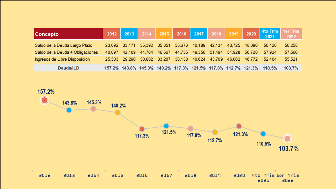El indicador que se refiere al Servicio de la Deuda y las Obligaciones respecto a los Ingresos de Libre Disposición, cerró el primer trimestre de 2022 también con resultados positivos, ya que se redujo de 9.1 por ciento a 8.8 por ciento.