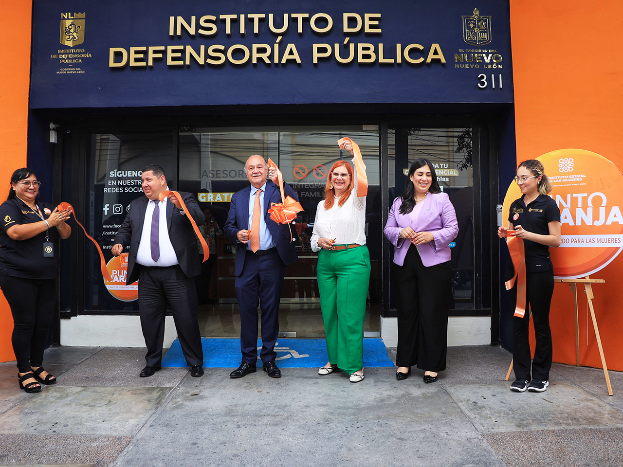 Monterrey, Nuevo León.- Como parte de las acciones de prevención de violencia contra las mujeres que realiza el Gobierno de Nuevo León, este martes fue inaugurado un Punto Naranja en las instalaciones de la Defensoría Pública del Estado por Javier Navarro Velasco, Secretario General de Gobierno; Miriam Hinojosa Dieck, Presidenta Ejecutiva del Instituto Estatal de las Mujeres y Héctor Viniegra Hernández, Director General del Instituto de Defensoría Pública.