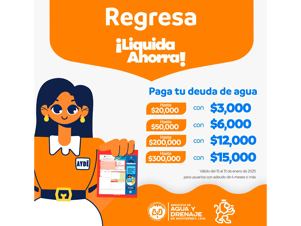 Monterrey, Nuevo León.- Servicios de Agua y Drenaje de Monterrey informa que, en el marco de los apoyos a la economía familiar que otras dependencias brindan durante el inicio del año, el programa de regularización de usuarios con adeudo de 4 meses o más en su recibo de agua “Liquida Ahorra” estará disponible de nuevo durante el periodo del 15 al 31 de enero de 2025.