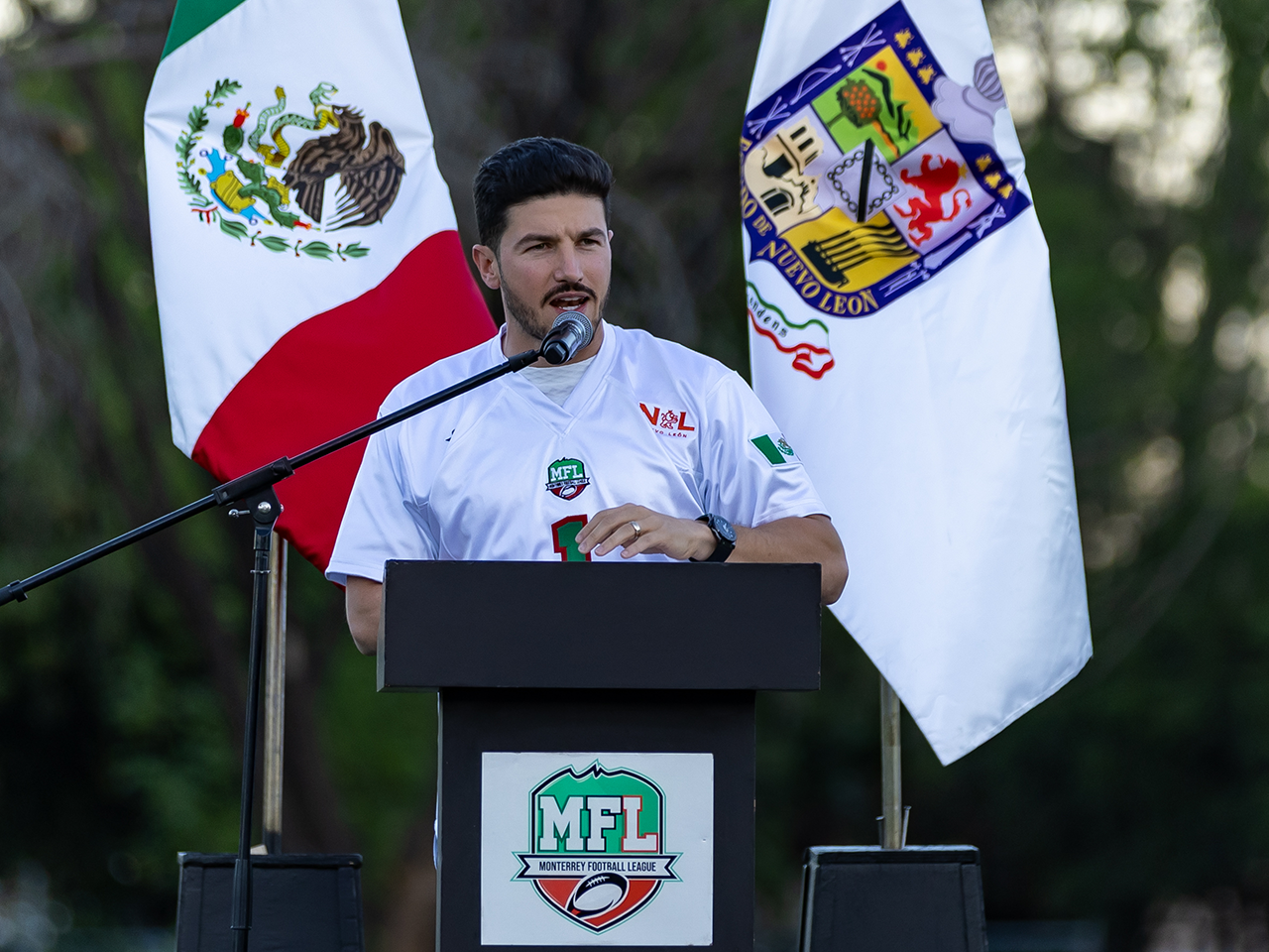 Monterrey, Nuevo León.- El Gobernador del Estado de Nuevo León, Samuel Alejandro García Sepúlveda, encabezó la inauguración de la nueva temporada de la Monterrey Football League (MFL) en el Estadio Bicentenario, ubicado en el Centro de Alto Rendimiento (CARE) “Niños Héroes”.