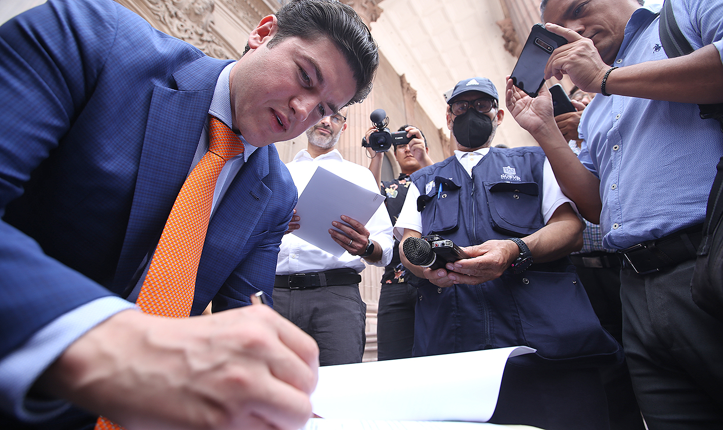 Acompañado por el alcalde de San Pedro, Miguel Treviño de Hoyos, y de colectivos de ciclistas, el gobernador entregó este veto en la Oficialía de Partes del recinto Legislativo,