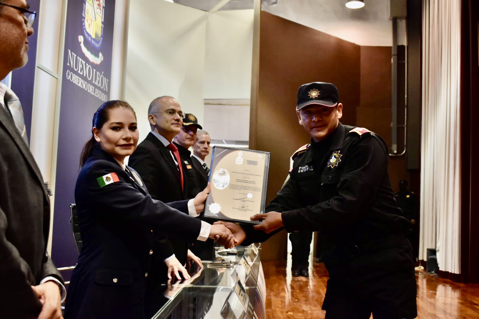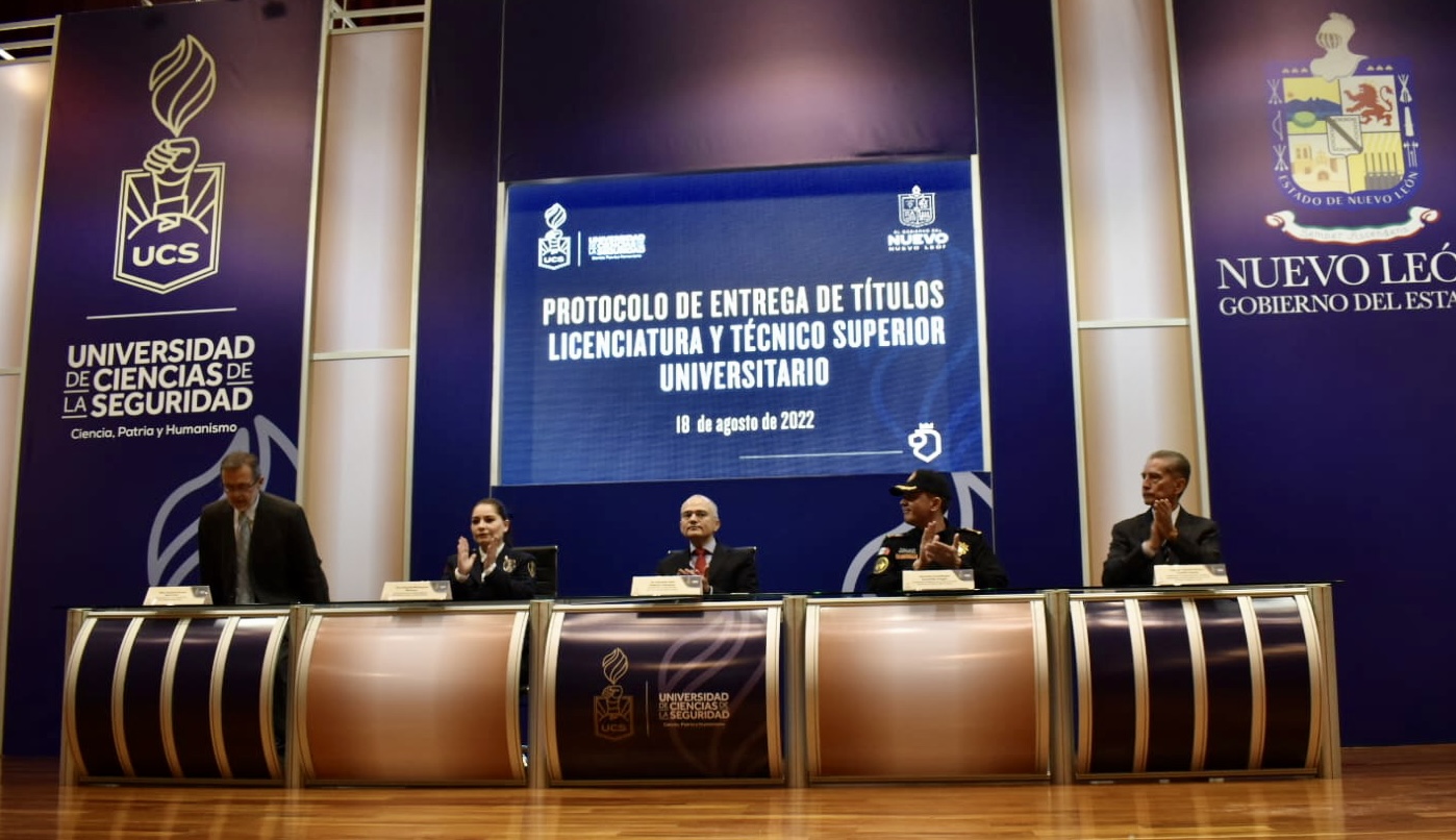 A la ceremonia de graduación también acudieron el Comisario de Fuerza Civil, Gerardo Escamilla, Olga Patricia Mena Treviño, Directora de Profesionalización de la Universidad de Ciencias de la Seguridad, y el Capitán Hamlet Álvaro Castilla García, Consejero Ciudadano, en representación de Ana María Esquivel Hernández, Presidenta Ejecutiva del Consejo Ciudadano de Seguridad Pública del Estado de Nuevo León; y el Maestro Octavio Carrera Santa Cruz, Presidente de la Comisión de Carrera Policial
