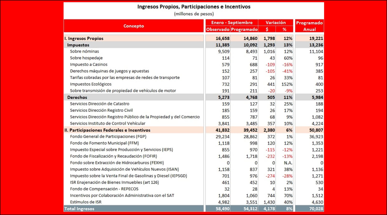 La dependencia agregó que los ingresos propios –compuestos por recaudación de impuestos y pago de derechos- crecieron 26 por ciento más respecto a lo registrado en el periodo enero-septiembre de 2021, y sumaron 16 mil 658 millones de pesos. Esta cantidad superó en 12 por ciento lo programado.