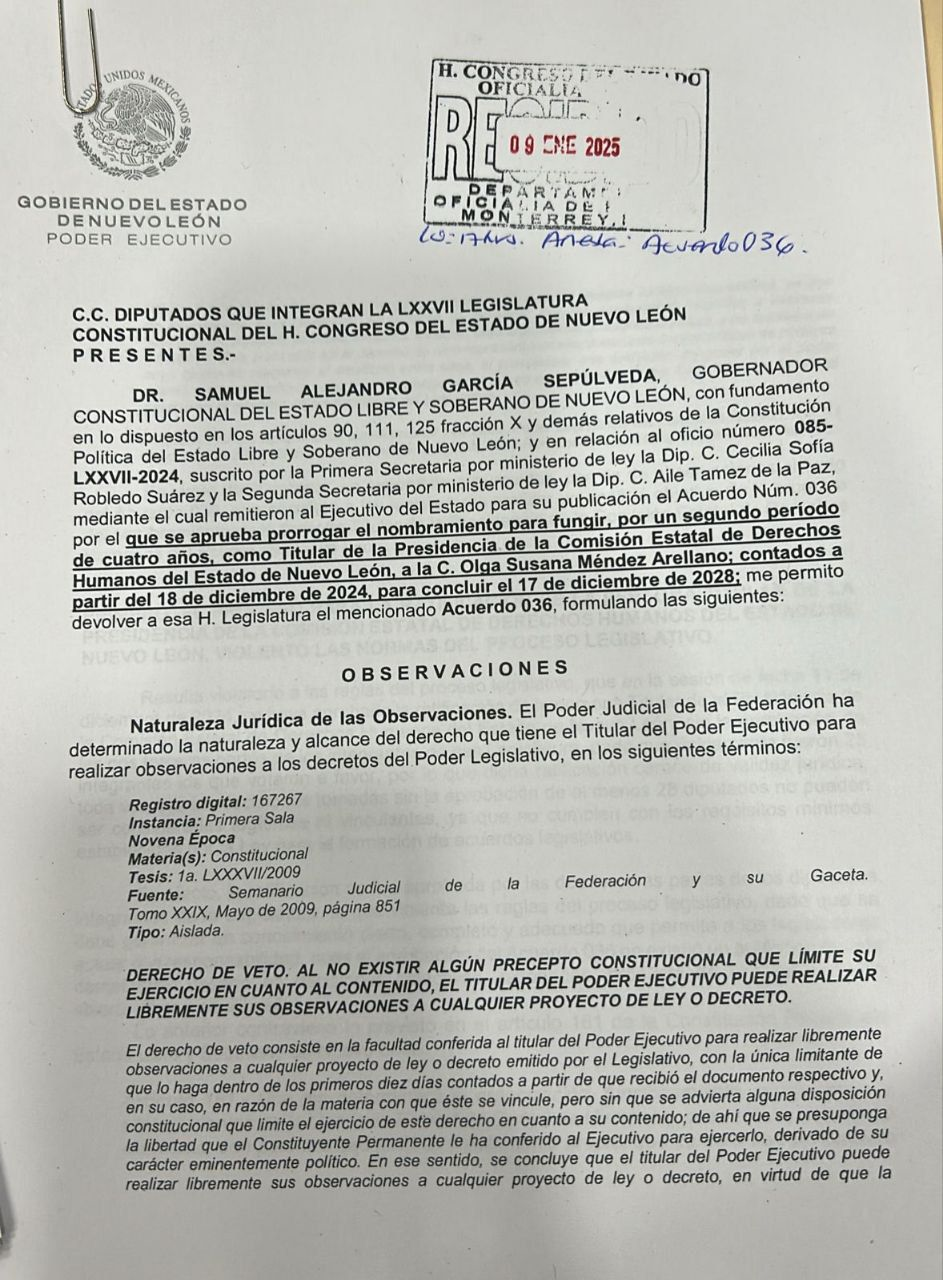 Monterrey, Nuevo León.- El Ejecutivo del estado realizó observaciones a la remisión de Acuerdos, respecto al proceso de selección de la titular de la Comisión Estatal de Derechos Humanos, ya que el Congreso incumplió tanto con la Constitución del Estado de Nuevo León, como con la Ley de la Comisión Estatal de Derechos Humanos, en donde señala que debe de realizarse una consulta pública transparente y que se requiere el voto de las dos terceras partes de los integrantes del Congreso.