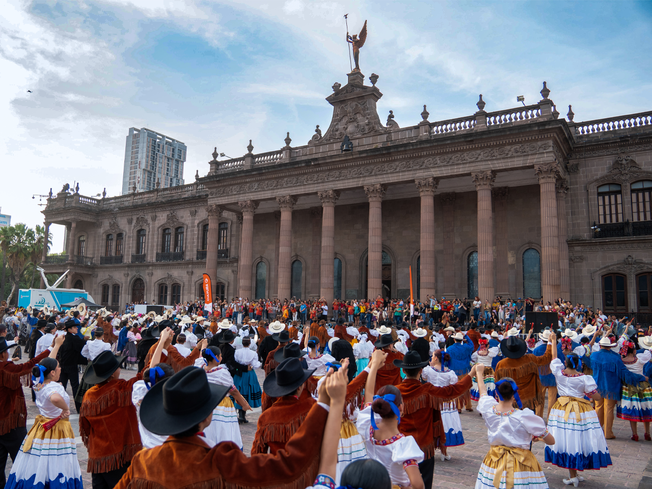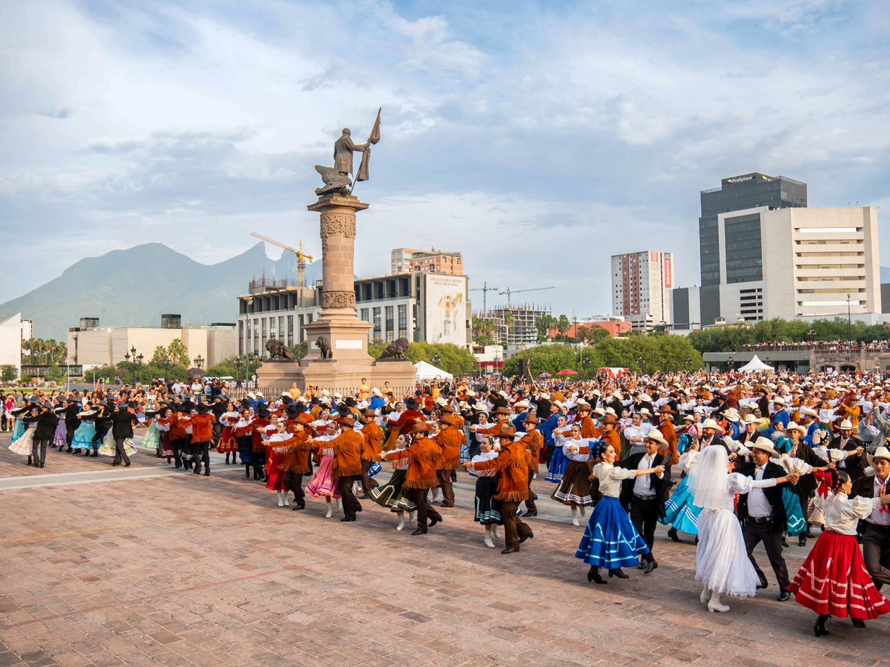 - Más de mil 600 bailarines se reunieron en la Macroplaza para celebrar el folclor de Nuevo León, bailando polka, chotis y huapango.