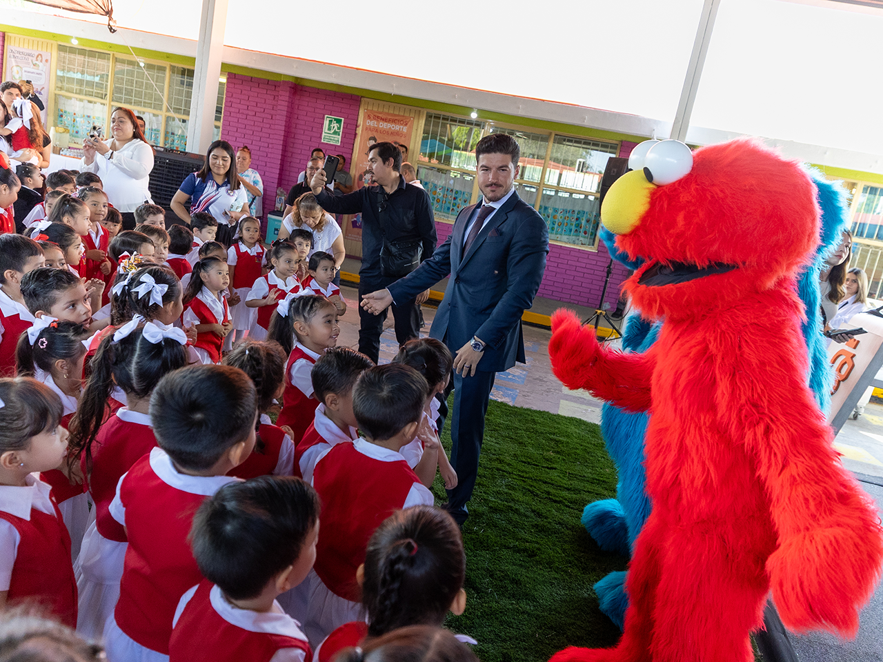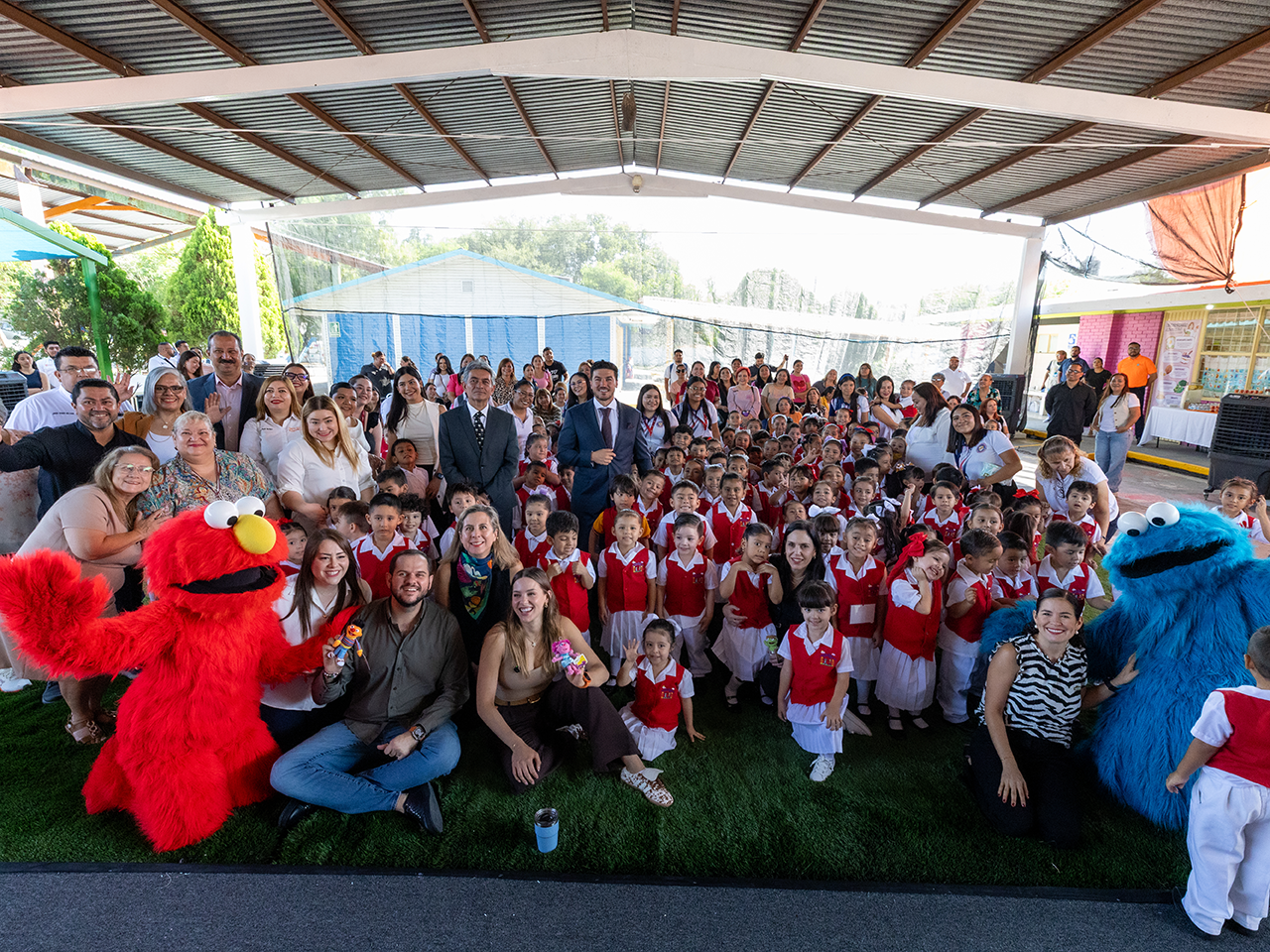 Luego del acto protocolario las niñas, niños, maestros, padres de familia e invitados convivieron y se tomaron fotografías con las botargas de Plaza Sésamo.