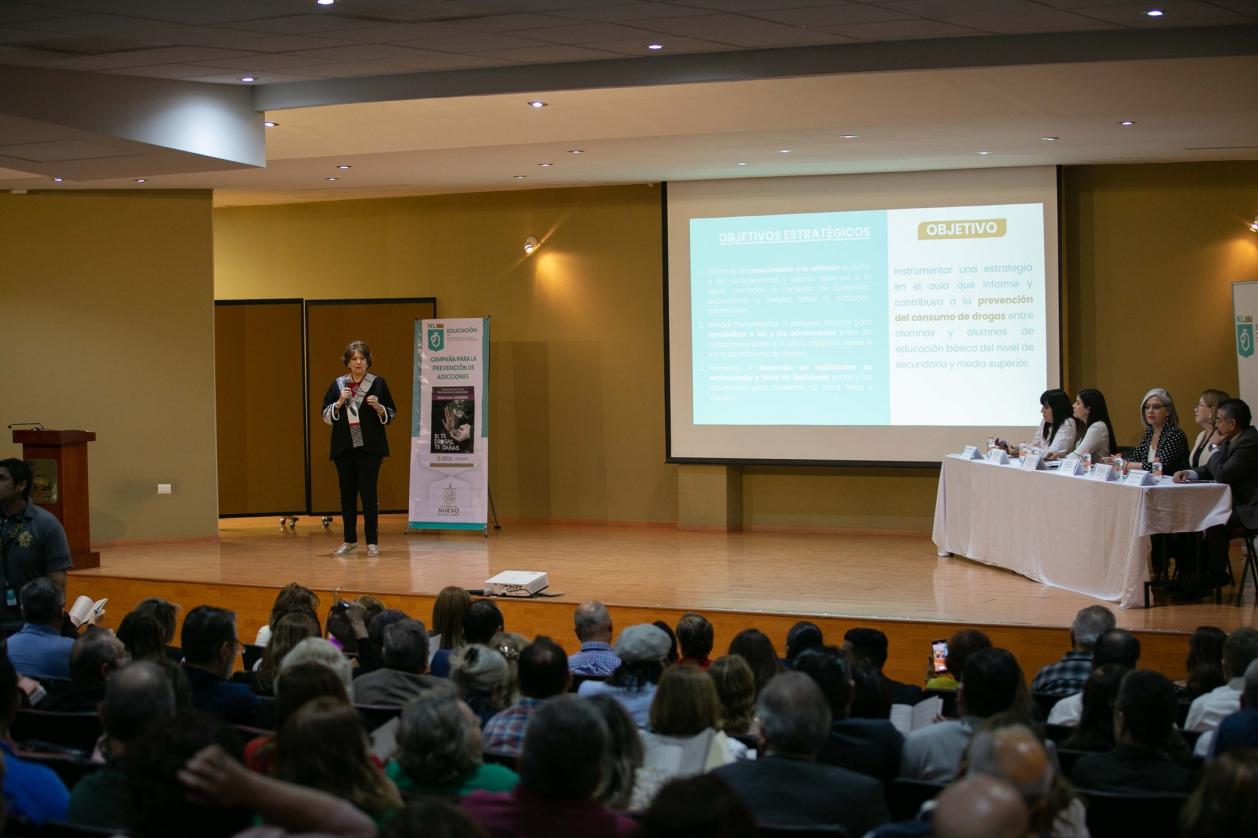 En el lanzamiento de la campaña “Si te drogas te dañas” a nivel estatal, realizado en el auditorio de la Normal Superior “Moisés Sáenz Garza”, estuvieron presentes la Secretaria de Educación de Nuevo León, Sofialeticia Morales Garza, así como cerca de 350 personas, entre supervisores, inspectores y directores de educación secundaria, quienes difundirán la información recibida en la zona correspondiente.