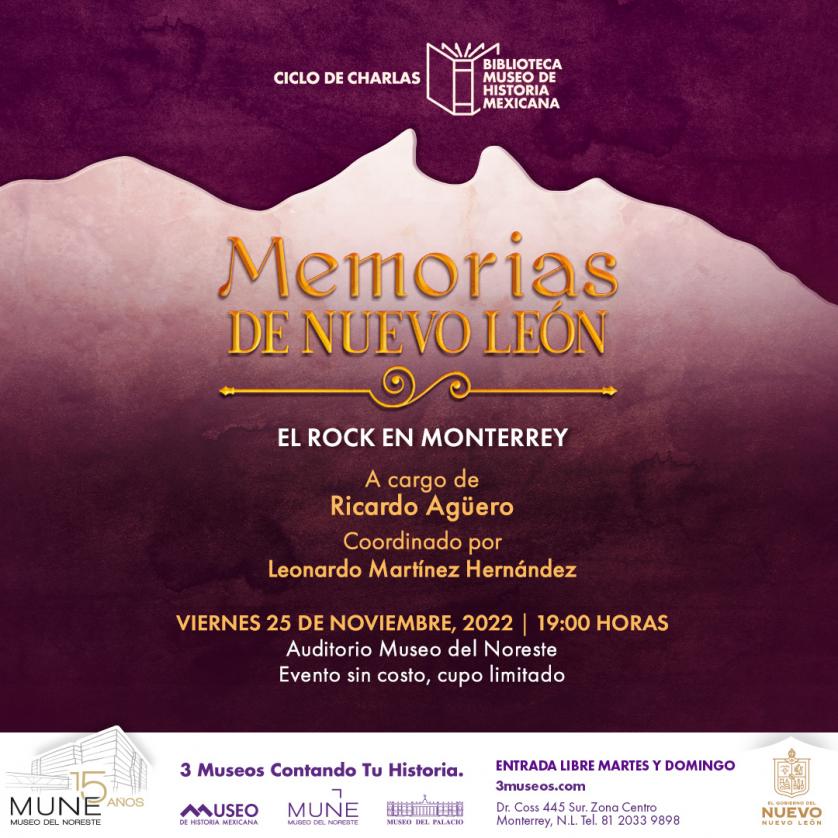 La conferencia el Rock and Roll en Monterrey se realizará el viernes 25 de noviembre a las 19:00 horas en el Auditorio Museo del Noreste MUNE. Para más información visite la página www.3museos.com o en las redes sociales de 3Museos.