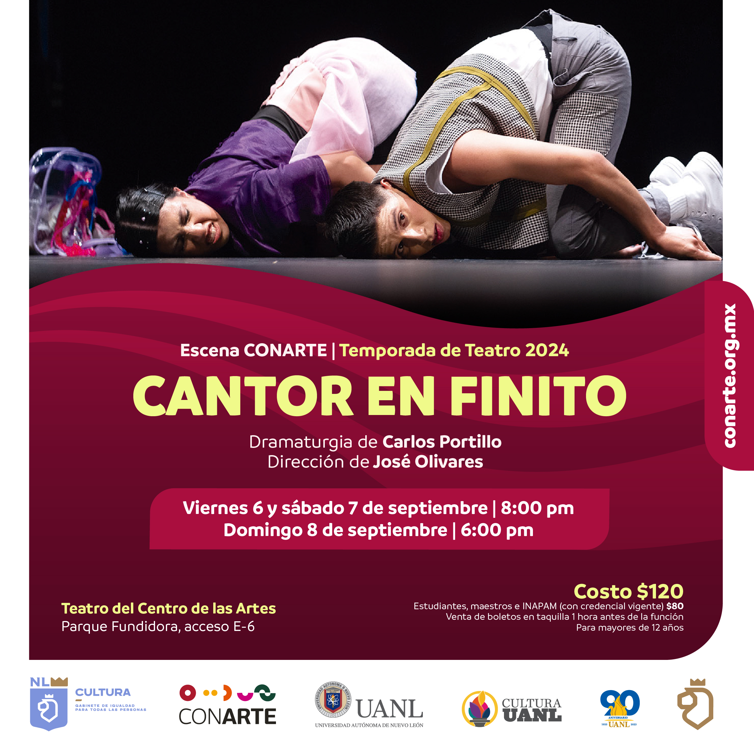 Monterrey, Nuevo León.- Como parte de la Temporada de Teatro 2024 de CONARTE, llega a escena la obra “Cantor en finito”, con la dramaturgia de Carlos Portillo y dirección de José Olivares.