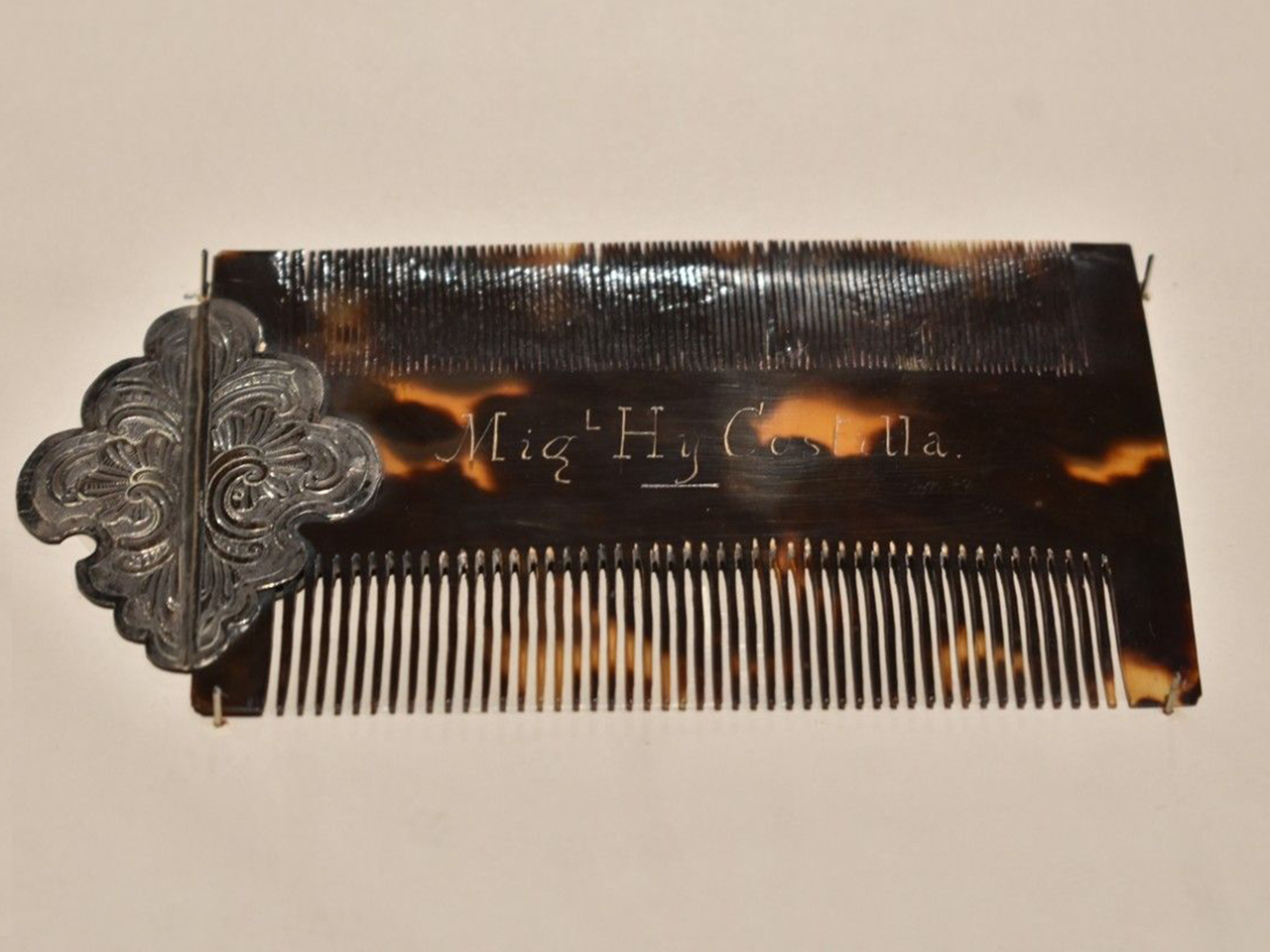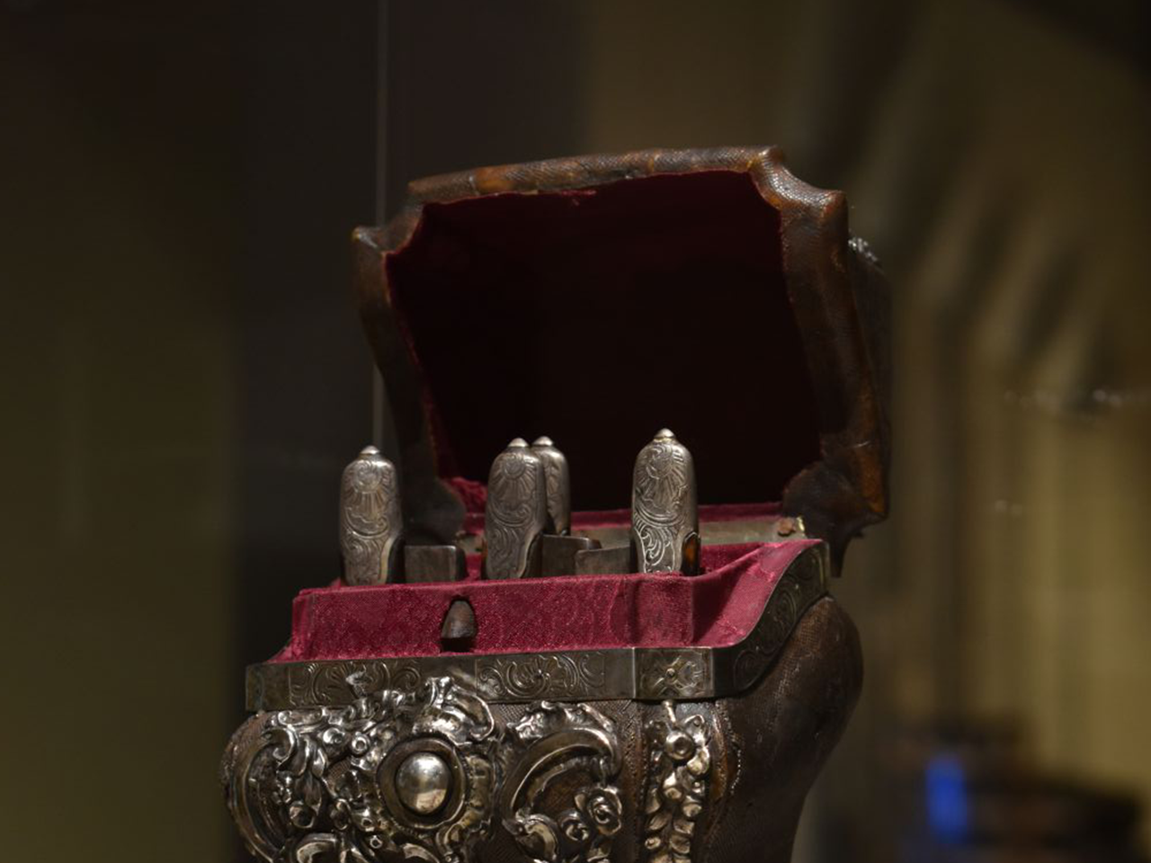 El estuche en exhibición es un reflejo del refinamiento de la vida privada en la Nueva España del siglo XVIII. Consta de ocho piezas cuidadosamente diseñadas: un espejo con detalles en plata, cinco navajas plegables, una herramienta de afilado y un peine de carey grabado con la inscripción "Migl Hg Costilla".