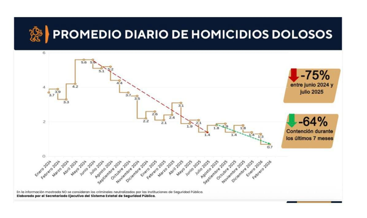 Igualmente, el promedio diario de los cuatro tipos de robo de alto impacto (casa habitación, negocio, persona y vehículo) se sostuvo en 28, el mes más bajo en los últimos dos años, empatado con junio de 2025.