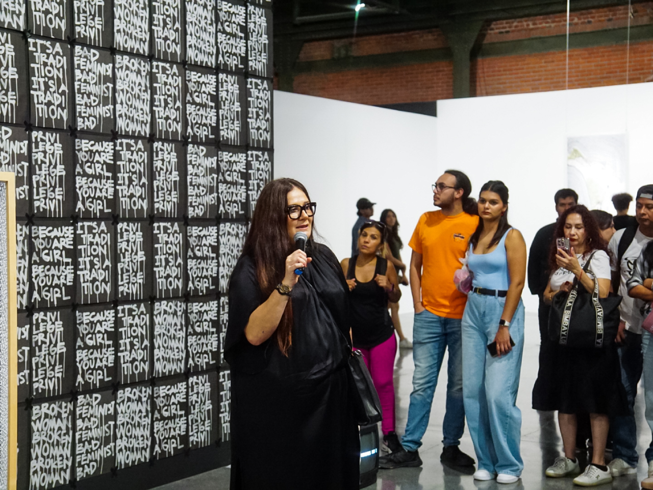 Martínez, artista multidisciplinaria nacida en Monterrey, pero con residencia en Ciudad de México, tomó el micrófono del sonido ambiental para dar la bienvenida e iniciar la caminata alrededor de las piezas de su autoría, colocadas en la sala principal de la Nave II del Centro de las Artes, en el interior del Parque Fundidora.