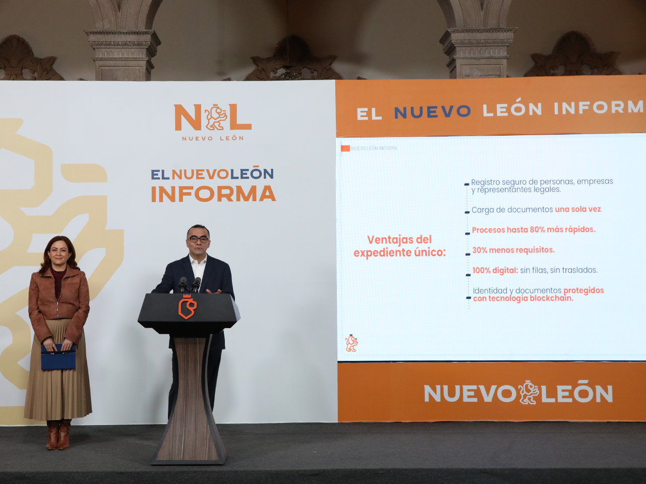 La Jefa de la Oficina Ejecutiva, Mariela Saldívar; y el Director General de la Comisión Estatal de Mejora Regulatoria, Julio Aguilar, presentaron los avances de la plataforma digital en el Nuevo León Informa de este martes.