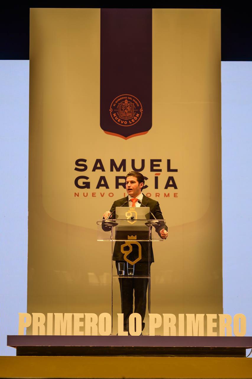 Arropado por Mariana Rodríguez, de AMAR a Nuevo León, funcionarios de la Federación, Gobernadores, ex Gobernadores, Secretarios y Secretarias de Estado, Senadoras, Senadores, Diputadas y Diputados federales y locales, representantes de los tres niveles de Gobierno, del Ejército Mexicano, empresarios y sociedad civil, el Mandatario destacó los logros y el estado que guarda la Administración Pública, así como el ejemplo que representa Nuevo León para el país.