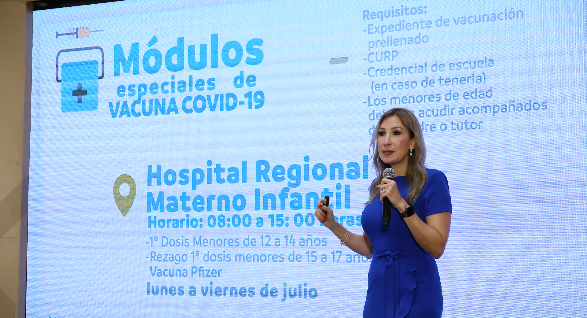 Señaló también que esta mañana arrancó la vacunación de menores de 12 a 17 años en el módulo permanente instalado en el Hospital Regional Materno Infantil, en donde durante el mes de julio aplicarán primeras dosis del biológico Pfizer a adolescentes de 12 a 14 años, y rezagos de primeras dosis a jóvenes de 15 a 17 años.