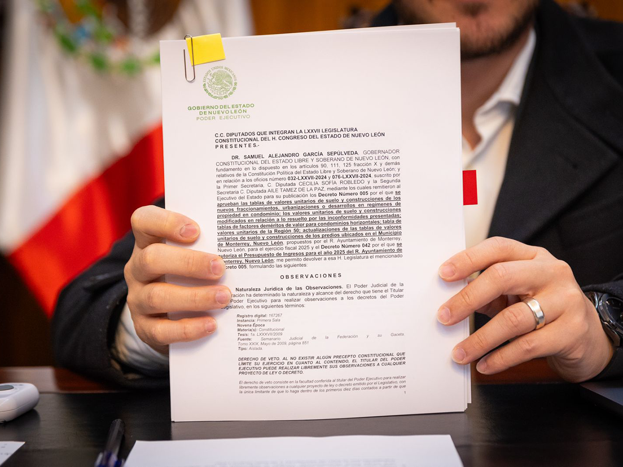 Monterrey, Nuevo León.- Al considerarlo excesivo y un “atraco” a las familias regiomontanas, el Gobernador del Estado, Samuel Alejandro García Sepúlveda firmó el decreto de veto al aumento del impuesto predial del 30 por ciento que plantea el Municipio de Monterrey, y lo mandó para su análisis al Congreso del Estado.