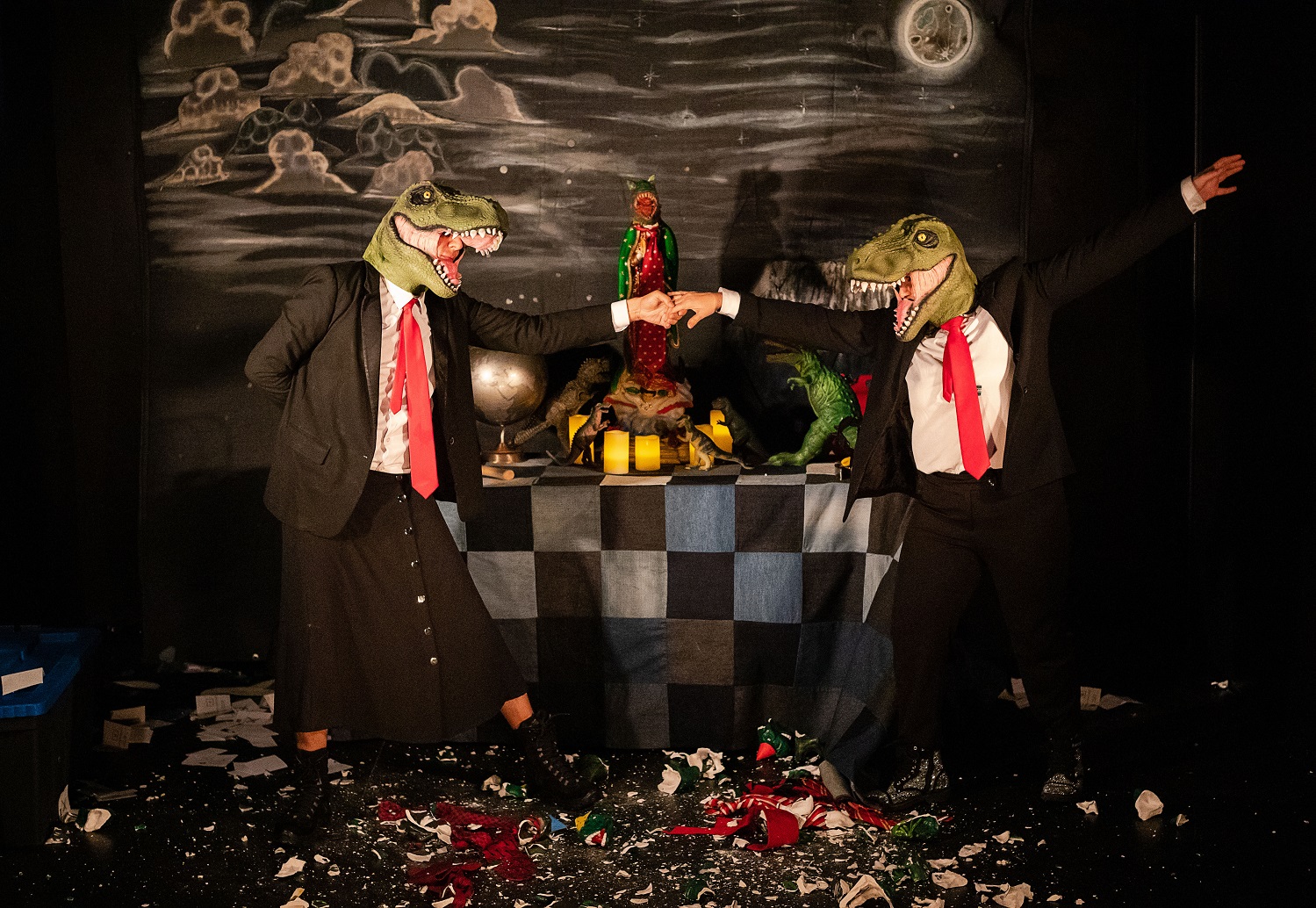 Nuestro trabajo en los últimos años ha derivado hacia el teatro objetual (cómo entendemos nosotros nuestro teatro objetual), por esta razón, la escena estará llena de diferentes tipos de monstruos parecidos a los dinosaurios (fondo que genera sentido, incluso un excedente de sentido), dichos monstruos serán manipulados por la y el performer durante el montaje-instalación, se propone jugar con referentes naif y de la cultura pop para aligerar lo presentado.