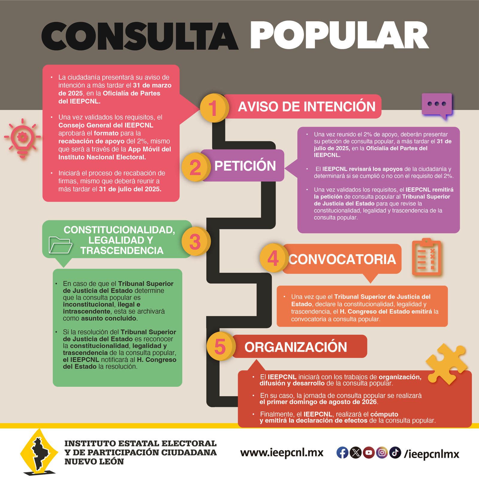 Si eres ciudadana o ciudadano del estado de Nuevo León, puedes someter a Consulta Popular la realización de un acto o decisión de las auroridades representantes de cualquiera de los 3 poderes. Consulta las bases y presenta tu escrito de aviso de intención de consulta popular en el Instituto Estatal Electoral y de Participación Ciudadana de Nuevo León.