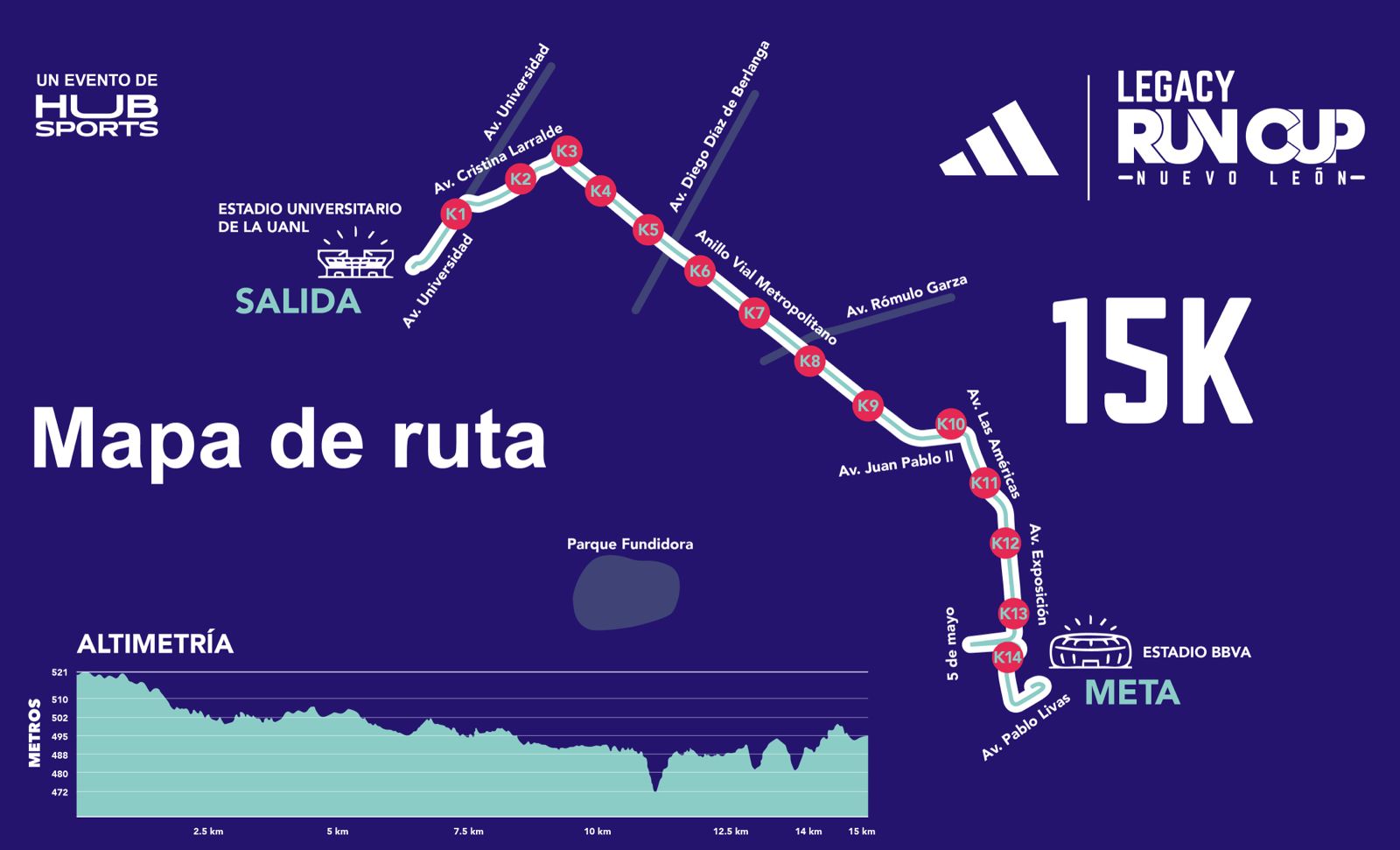 En el marco de los preparativos rumbo a la Copa Mundial de la FIFA 2026, te invitamos a participar en esta carrerae de 15 kilómetros en la que los participantes realizarán un recorrido emblemático, que iniciará en el Estadio Universitario y concluirá en el Estadio BBVA, además los corredores podrán elegir y representar a una de 11 selecciones mundialistas.