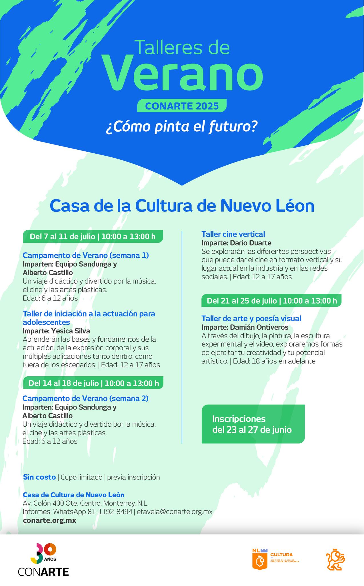 Si tus hijo tienen entre 6 y 17 años y deseas que pasen un verano aprendiendo y divirtiéndose, inscríbelos en el Verano CONARTE que la Casa de la Cultura tiene preparados para ellos. Descubrirán el arte textil, el lenguaje del cine y mucho más. Pueden acudir desde una o las 3 semanas.